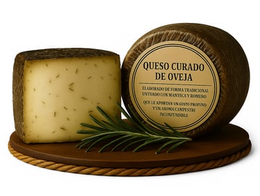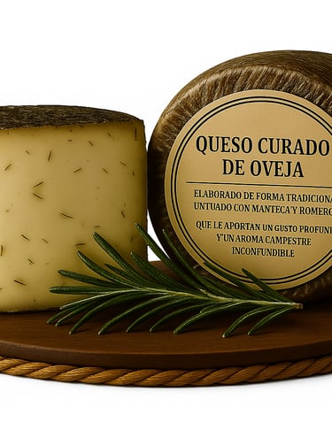 Queso de oveja curado al estilo tradicional, con manteca y romero, sabor de la tierra .