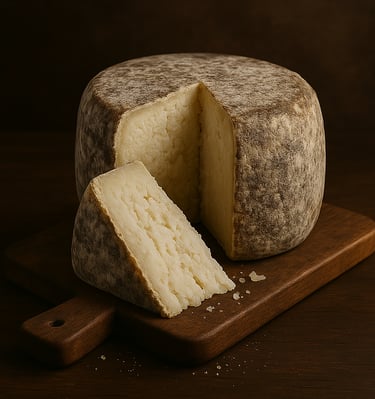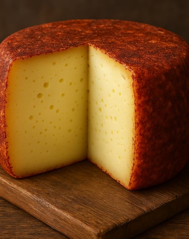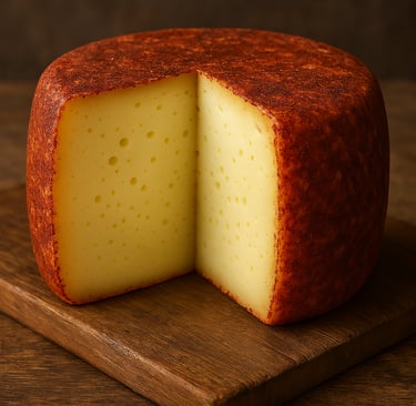 Queso de oveja curado tratado externamente con manteca y pimentón, dando textura suave y un pequeño toque de picor.
